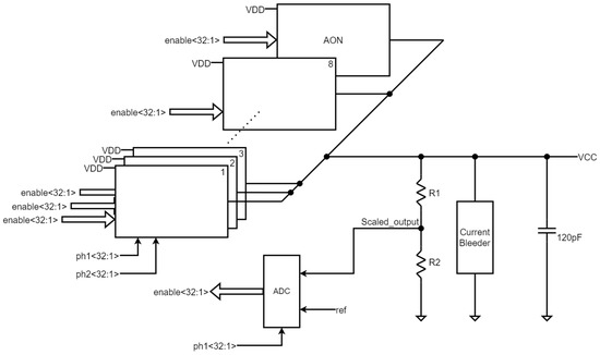 The proposed regulated charge pump consists of eight adaptable tiles, an always-on (AON) tile, a resistor divider to sense the output voltage using a scaled version of the output voltage VCC, a pseudo-6-bit analog-to-digital converter (ADC) whose output code controls the eight charge pump tiles, a small output capacitor, and a current bleeder as shown in Figure 2. The circuit also has some logic used to create the soft start. A modular design approach is chosen to allow for scaling the output current by increasing the number of tiles controlled by the ADC.