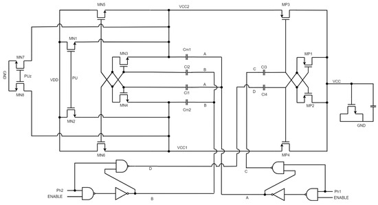 Each tile consists of 32 charge pump units connected in parallel. The Dickson charge pump [14] is used in the system. Each of the 32 charge pumps operates with two complementary phases of 32 phases of a 200 MHz clock. The charge pump circuit is based on the work of [15]. The schematic of the differential charge pump implementation is shown in Figure 3. Cm1, Cm2, Cl1, Cl2, Cl3, and Cl4 are all implemented using PMOS devices but drawn as capacitors for simplicity. When enabled (PU is high and PUz is low), the charge pump main capacitors, Cm1 and Cm2, are charged through MN1 and MN2. The toggling of Phi1/Phi2 charges VCC1 and VCC2 to switch between VDD and 2 × VDD. Cl1 and Cl2 act as level translators and ensures that the gates of MN3, MN4, MN5, and MN6 are biased properly by switching between VDD and 2 × VDD. The logic created by the NAND gate and the two inverters ensures that MN3, MN4, MN5, and MN6 are closed before MP1, MP2, MP3, and MP4 are opened. Cl3 and Cl4 also act as level translators, properly biasing the PMOS output devices. VCC is connected to VCC1 or VCC2 when they are charged to 2 × VDD. This way, VCC stays at a 2 × VDD level during the circuit operation. MN6 and MN7 are used to discharge Cm1 and Cm2 (also Cl1, Cl2, Cl3, and Cl4) when the charge pump is turned off.