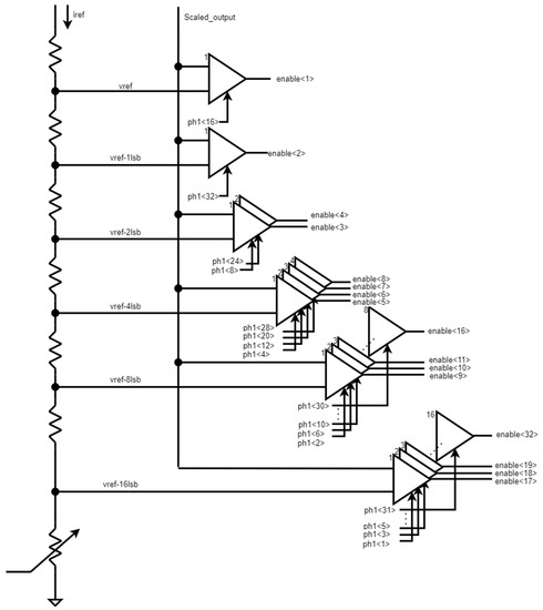The pseudo-ADC is shown in Figure 4. The ADC has a resistor ladder that generates six levels to compare to: vref, vref—1 × least significant bit (LSB), vref—2 × LSB, vref—4 × LSB, vref—8 × LSB, and vref—16 × LSB. The iref current comes from the Bandgap (BG) circuit. The resistors should use the same unit resistor used by the BG to track its variation to get an accurate reference. There is a programable resistor that helps change the value of vref as needed through a digital code.