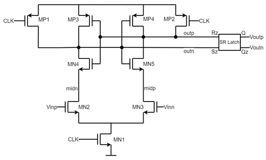 When the CLK is high, MN1 is turned on while MP1 and MP2 are turned off. If Vinp is higher than Vinn, this will cause a higher current to pass through M2 than M3. This will make midn voltage go lower than midp. MN4/MP3 and MN5/MP4 act as cross-coupled inverters. When midn decreases, MN4 sees a higher VGS driving outn to zero, which drives outp to supply. Since the cross-coupled back-to-back inverters act as a positive feedback loop, a reset for the comparator is needed every clock cycle, which happens when the CLK is low enabling MP1 and MP2, which pulls outp and outn to the supply. An SR latch ensures that the comparator maintains its output value without being reset.