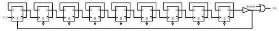 where DOK is the OK delay, TCLK is the clock duration, and n is the number of stages. Since nine stages are used, the delay will be 5 ns × 2(9−1) = 1.28 us. The OR gate at the end bypasses the OK circuit if needed. When the BYPASS signal is low, the OK will go high after the specified delay. When BYPASS is high, the OK is high regardless of the delay implemented and the clock used at the circuit’s input.