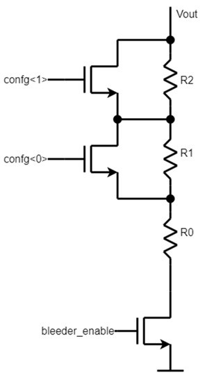 A similar situation occurs during transitioning from maximum load to zero when a lot of charge pumps are active. If the change from high to low is rapid, an overshoot will be observed, and the output will settle on a wrong value. A solution to this is to add a simple current bleeder circuit, shown in Figure 7. The idea is to maintain a small amount of current that forces the output to discharge to the expected level. The current bleeder has 2 bits of programmability to control the amount of current. The current bleeder current ranges from 50 uA when config<1:0> = 11 to 12.5 uA when config<1:0> = 00 at 3 V output. The values are too small to affect the startup or cause a short between the output and the ground. For lower voltage outputs, the range changes, so the programmability is here to ensure adequate bleeded current for several ranges of outputs.