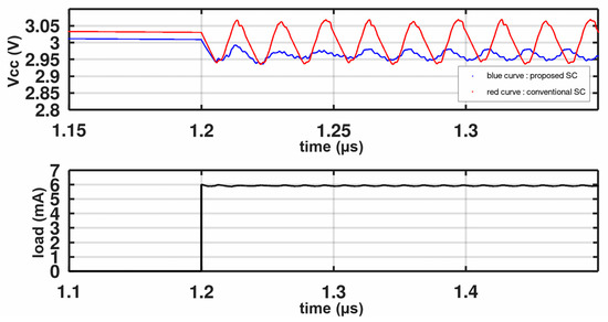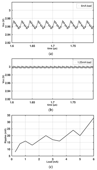 Extra tiles can be added to increase the current on the expense of area. The added tiles share the same control and can be placed beside the control block. Adding 24 extra tiles will increase the load current to 24 mA, and the area will be 0.9726 mm2, provided the tiles are placed as 2 ∗ 8 tiles on each side of the control block. While adding the extra tiles, a significant modification is made while connecting them; they are connected with a 90-degree phase difference. In this case, lower ripples are achieved while adding the extra tiles. Figure 15 shows the behavior of the 32 tiles when connected as mentioned above while changing the load from 0 to 24 mA in 100 ps. The ripples are 3× lower than the normal eight tiles configuration. Table 2 compares the proposed converter with the state-of-the-art literature.