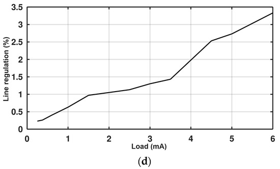 The ripples of the output at different load levels: (a) 6 mA load; (b) 1.25 mA load; (c) ripples vs. load; (d) line regulation vs. load.