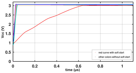 Figure 9 shows the startup of the regulator when enabling and disabling the OK circuit. The circuit starts in less than 50 ns while the OK circuit is disabled but settles ~50 mV higher than the regulated value and increases to 80 mV across PVT. The current bleeder circuits make sure it discharges to the final value. If the current bleeder is disabled, the output will settle on the final value. With the OK circuit enabled, the circuit starts in approximately 650 ps. The OK will go high in 1.28 us, as explained earlier. The slow startup with the OK is due to having fewer charge pumps enabled during a soft start. Only 16 charge pumps are enabled during a soft start. If the soft start is disabled, 288 charge pumps are enabled at startup.