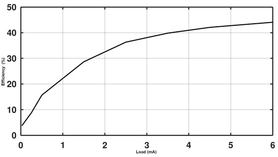 The undershoot due to the fast transition of load from low to high is approximately 3% of the output and takes approximately 500 ns to stabilize and continue working normally. The overshoot due to the fast transition from maximum to zero load is approximately 1%, and the current bleeder ensures that the output discharges back to its nominal value. Efficiency versus several loads is shown in Figure 12. Efficiency is calculated as Pout/Pin. Pout is our output voltage (3 V) multiplied by the load current, whereas Pin is the input voltage (1.8 V) multiplied by all the currents consumed from this supply. A peak efficiency of 44% is achieved at maximum load (6 mA). The maximum theoretical efficiency is 83.3%. The system efficiency is relatively low because of using 32 comparators for the charge pumps instead of using one comparator for all the charge pumps. Additionally, the converter uses 2.5 V devices with a 3.3 V overdrive which is large and introduces more switching losses. Another factor that degrades the efficiency is the losses in the charge pumps due to the usage of MOS capacitors to reduce the silicon area which have higher parasitic losses.