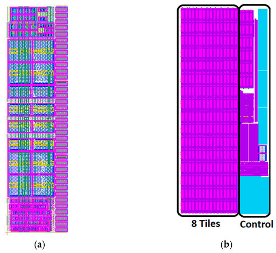 The layout of the unit charge pump is shown in Figure 14a. The area of the unit charge pump is compact, using 14.16 µm × 53.1 µm. They can be stacked together to create large tiles as being used in the proposed design, which uses 32 units per tile. Figure 14b shows the floorplan for the proposed system, taking an area of 337.395 µm × 881 µm. Figure 15b shows the tiles stacked together and the control block with the AON tiles, 32 comparators, the current bleeder, the output capacitor, the resistor divider, and logic needed to control and drive the tiles.