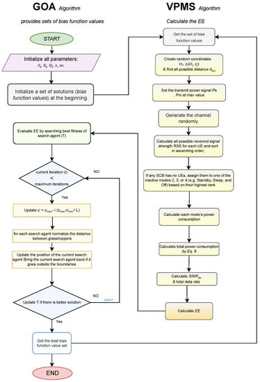 Initially, the GOA algorithm generates a random population of various sets of solutions, each of which consists of a set of bias function values (Algorithm 1 summarizes the steps in GOA algorithm). Next, in order to compute the solution’s fitness and obtain the EE value, the VPMS algorithm (Algorithm 2) is called, which is subsequently passed back to the GOA algorithm again. Figure 4 shows the proposed logic flow diagram.