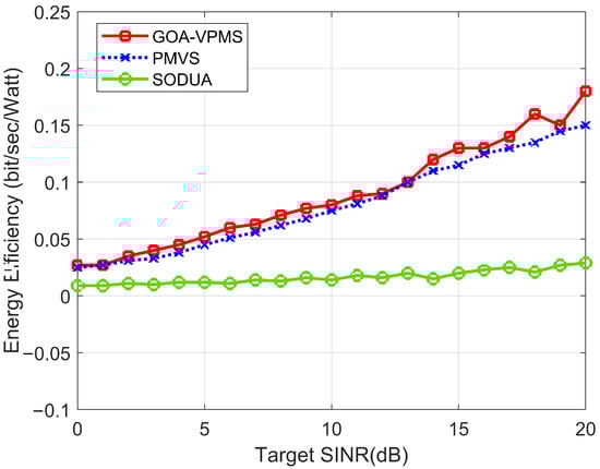 As expected, the scheme with no sleep control has a significant increase in power consumption because all of the SCBs are active at all times. On the other hand, the considered system model shows there is a relatively lower power consumption associated with the conventional sleep control scheme, whereas the scheme of random sleep 20% consumes slightly more power than the scheme of random sleep 30% and the conventional sleep method. However, the simulation demonstrates that all the previous schemes, such as those without sleep control, conventional sleep control, random sleep 20%, and random sleep 30%, are outperformed by the proposed GOA-VPMS by 66.04%, 54.72%, 49.06%, and 44.65%, respectively. This refers to the fact that our scheme does not take into account load or traffic variation, which we may include in our future work. Further to evaluating the performance of the GOA-VPMS algorithm, we compare it with both the Switching Off Decision and User Association (SODUA) and Power Mode Variant Selection (PMVS) algorithms [,], from an EE and spectral efficiency (SE) point of view, as shown in Figure 6 and Figure 7, respectively.