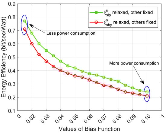 In line with expectations, the proposed algorithm outperforms both the SODUA and PMVS algorithms in terms of maximizing EE by 67.23% and 9.38%, respectively, and enhancing SE by 20.9% and 15.23%, respectively, for the entire two-tier network. This is because the SODUA algorithm only uses the switched-off mode, whereas our GOA-VPMS algorithm has more flexibility and considers four different operation modes (e.g., on, standby, sleep, and off). Furthermore, GOA is able to outperform other algorithms in the literature, as mentioned in [], e.g., the GA (Genetic Algorithm). More comparisons and discussion about the convergence between GOA and GA are provided at the end of this section. In addition, we fixed one bias function value and relaxed the others for more comparison and evaluation of the performance of our proposed scheme, as shown in Figure 8 and Figure 9.