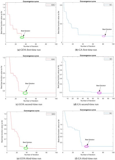 We can see that even though the bias function values vary from 0 to 0.9 and from 0 to 0.1, respectively, the EE is still optimized. In Figure 8, we can see a trade-off between the values of the bias function and maximizing the EE, where the curve related to MCB in (on) operation mode is slightly decreased, meaning that the reduction in power consumption is minimal, while the curve related to (on) SCBs gradually decreases, meaning more power consumption can be reduced and therefore more EE. On the other hand, Figure 9 explains the most significant reduction in power consumption for inactive SCBs that are in (standby) and (sleep) operation modes. It is noted that the SCBs in sleep operation mode consume less power than in standby operation mode. Furthermore, Figure 10 represents the convergence curves of GOA and GA in multiple time runs, indicating how many iterations each algorithm requires for a solution to be obtained. In addition, we can identify the most optimal solution for each algorithm by studying the curves. In Figure 10a,b, it can be seen that in the first case, the GOA algorithm reaches the best solution before GA. It is also shown that in the second-time run in Figure 10c,d, GOA outperforms GA in terms of requiring a smaller number of iterations to reach the optimum value of the bias function. On the other hand, in Figure 10e,f, there is a minimal difference between both GOA and GA in terms of reaching the best solution. Taking into account the results of this study, we conclude that both GOA and GA are capable of efficiently solving this problem. Both of them work very similarly, so we can use either of them to achieve our goals. As the no-free-lunch (NFL) theorem [] states, no single optimization can solve all problems; any other optimization is not guaranteed to produce the same results. However, because this is a small scenario with only one MCB and 50 SCBs, the reduced power consumption and EE may not be significant when compared to the reality scenario with more MCBs and several SCBs that we may apply in our future work.