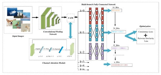 The feature extraction module of the ADMTH is mainly constructed by fusing the typical convolutional neural network (CNN) structure and attention mechanism, and a sub-branch network in accordance with the concept of multi-task learning [32,33,34,35,36]. Generally, there are two types of multi-task learning: hard parameter sharing [37] and soft parameter sharing [38]. The former method means that each task guarantees the consistency of the bottom parameters learning, meanwhile, distinguishing top features learning by multiple independent parameters. In contrast to the above, the latter method means the independence of global feature learning. In other words, each task has its own set of parameters and basically no parameter sharing among them. It can be found that the hard parameter sharing method has fewer parameters, which contributes to efficiency. Specifically, in ADMTH, the learning of hash codes of different lengths can be viewed as multiple objective tasks. The part of parameter sharing occurs in the front five layers of the feature extraction network. After that, each sub-network parameter is not shared but iteratively converted in conformity with the corresponding target hash code. Based on differentiated learning, the model can generate the binary code representation to the same image with different lengths very well.