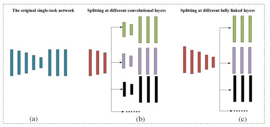 Different ways of parameters sharing. The subfigure (a–c) represents three types of structures respectively: single-task networks, networks split at the convolutional layers, and networks split at the fully connected layers.