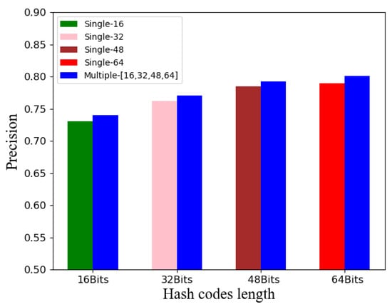 Figure 3 shows a comparative experiment of simultaneous generation of multiple lengths hash codes via multi-task and decentralized generation of a set of corresponding hash codes via single-task, respectively. The results indicate that simultaneously learning multiple length hash codes with the optimization of and could better excavate the potential semantic relationship among these, further enhancing the image representation capability. Figure 4 demonstrates the significance of introducing the channel attention module, which manifests that the learning of shallow features is directly related to that of the final high-level representation, making the module better emphasize fine-grained information among image categories.