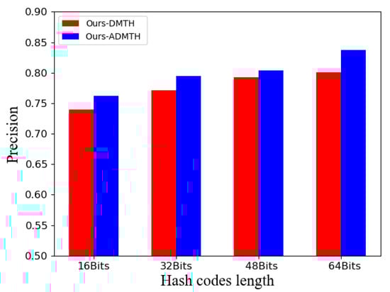 The results demonstrate that ADMTH achieves the optimum in most cases. On the one hand, given that the ADMTH better learns the fine-grained information among image categories by integrating the channel attention module, the contained semantic information can be further enriched. On the other hand, the generated multi-length binary codes are optimized by combining the two proposed losses to better mine the semantic relevance involved in these hash codes, which contributes to the promotion of the single hash code characterization capability. Interestingly, we have to admit that the ADMTH generally achieves the optimal performance under the longer length condition. However, it is inferior to a certain method when the number of bits is low. The most likely cause is that the longer length hash code bits can guarantee the model to fully mine and train semantic relationships among hash codes of multiple lengths.