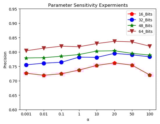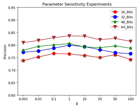 Firstly, all input images sizes are generally adjusted to 224 × 224 pixels. The proposed method is initialized by using a pretrained CNN-F model. Other deep hashing methods [15,16,17,18,19,20] also adopt similar initialization strategies. As for the channel attention mechanism, we adopt empirical settings and multiple cross-experiment verifications, and the number of c (channel) is set as 16 to perform channel-level operations on the feature map. Other pivotal settings are listed as follows: The programming implementation schema adopts Pytorch, meanwhile, the total loss is iterated with built-in SGD optimizer. The selected batch size is set as 128, and the periodic learning rate decay is adopted. The initial learning rate is set as 0.15, and during the iterative process, it is set to be 1% of the previous one every 30 iterations. The symbols and are the parameters set as 20 and 1, respectively. Specifically, we will study in the parameter sensitivity experiment later. Furthermore, we use a common metric in retrieval called mean average precision to evaluate the experimental performance, which is defined as follows: