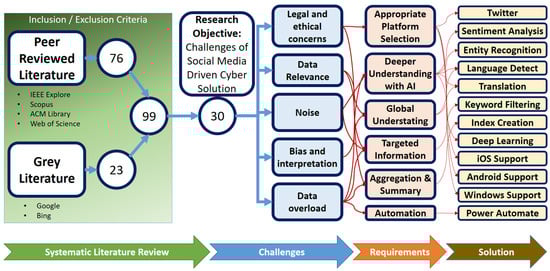 Keywords such as “cyber threat intelligence”, “social media”, etc. were used from peer-reviewed databases such as IEEE Explore, Scopus, ACM Library, Web of Science, and others. About 76 articles were identified from these peer-reviewed sources. Search engines such as Google and Bing also resulted in 23 grey literatures. Out of these 99 literatures, about 30 literatures were identified discussing the challenges of social media-driven cyber solutions. Table 1 shows the details of inclusion and exclusion for both peer-reviewed and grey literature searches.
