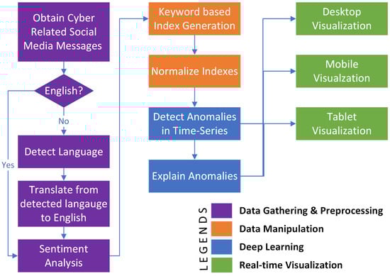 Once targeted messages are obtained, a range of artificial intelligence (AI)-based algorithms are executed as data preparation and preprocessing. These AI-based data preprocessing algorithms include language detection, translation, and sentiment analysis as demonstrated in [,,,,,]. As seen from Figure 1, for all non-English social media messages related to cyber, the language is detected followed by translation to English. Microsoft Cognitive Services’ Text Analytics API [] is used for performing this AI-driven task of language detection and dynamic translation. Microsoft Cognitive Services’ Text Analytics API [] is also used for performing sentiment analysis on the English-translated text (since sentiment analysis is only supported in the English language). Thus, by employing language detection and translation before the sentiment analysis process, social media posts in almost 110 different languages could be comprehended, as demonstrated in [,,,,,]. Other than comprehending social media posts and messages, this technique could also gather and analyze online news and articles from thousands of sources such as websites, online newspapers, blogs, etc. For example, global events from 2397 different global news sources have recently been obtained and analyzed in [,,].