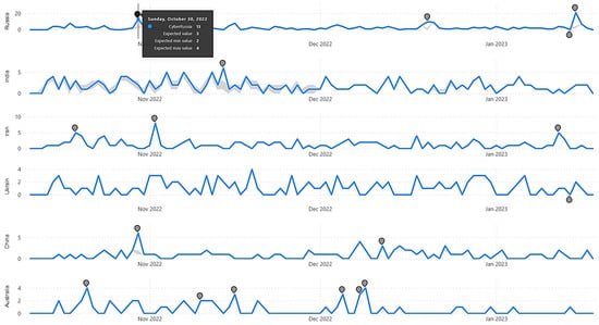 The innovative methods described within this study were tested and evaluated on a live Twitter feed from 14 October 2022 to 27 December 2022. During these 75 days, global social media posts related to cyber were captured and analyzed with artificial intelligence (AI)-based services such as language detection, translation, and sentiment analysis. By performing data manipulations on 15,983 tweets from 15,315 users (in 47 different languages), cyber threat index for 6 different countries were produced. Finally, convolutional neural network (CNN)-based anomaly detection (a deep learning method) was used to automatically identify anomalies on cyber threat indexes for China, Australia, Russia, Ukraine, Iran, and India. Unlike [,,], this work was evaluated on a mobile environment. It should be mentioned that these countries were not selected in a random manner. They were selected by considering a range of factors such as the number of social media users (i.e., the US and India have a huge number of Twitter users []), the concerns of the social media users (i.e., US Twitter users perceiving China and Russia as a cyber threat [,]), and current issues (e.g., Russia-Ukraine cyber war, cyber-attacks in Australia [,,,] etc.).