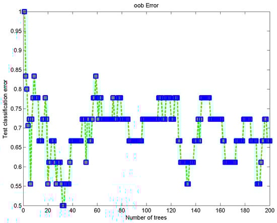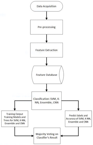 The KNN classifier uses Models 5, 10, and 15 with seed = 7, 14, and 21, Kfold = 3, and hp-candidates = n-neighbor was (n, 2,3,4,5,6,7). The best hyperparameters for KNN were hp-candidate, (n, 3); seed, 21; and input model, 15. SVM uses 3 types of hyperparameters: learning rate = 0.2; subsample = above 7; hyperplane = 255 × 255; and SVM models = (5, 10, 15). The SVM best model hyperparameter was 15. The ensemble uses trees instead of models. A total of 200 trees were generated, such as (0, 20, 40, 60, 80, 100, 120, 140, 160, 180, 200), and an ensemble uses these trees to generate different bags. The number of bags is similar to the number of trees. The total number of bags = (0, 20, 40, 60, 80, 100, 120, 140, 160, 180, 200). The best oob-loss was 0.65, and the reuse oob-loss at 200 trees was 0.00001. The best performance of the ensemble classifiers was achieved with the reuse oob-loss at 200 trees.