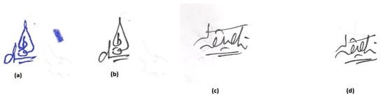 Pixel p0 must be explored; when pixel p0 is a bit of a skeleton, pixel p0 will be deleted or not eradicated by conditions. Regardless, in a one-way handle, the estimation of pixel p0 should be set to another concern, for instance, −1, as shown by Hilditch’s calculation [37], set to 0 until all pixels in the photo are examined along these lines. At this point, the procedure is rehashed until no advancements are made. Figure 2 contains the handwritten signature images of Urdu script which are used in the pre-processing phase of the proposed system.