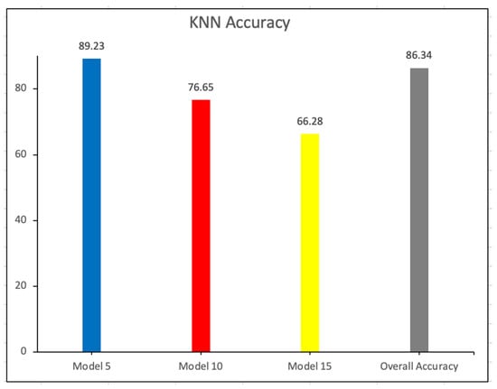 Figure 3 demonstrates the accuracy of KNN in various models. This methodology required additional time but reduced the overall computational cost. The accuracy of KNN Model 5 is the highest, at 89.23%. The overall accuracy is 86.34%.