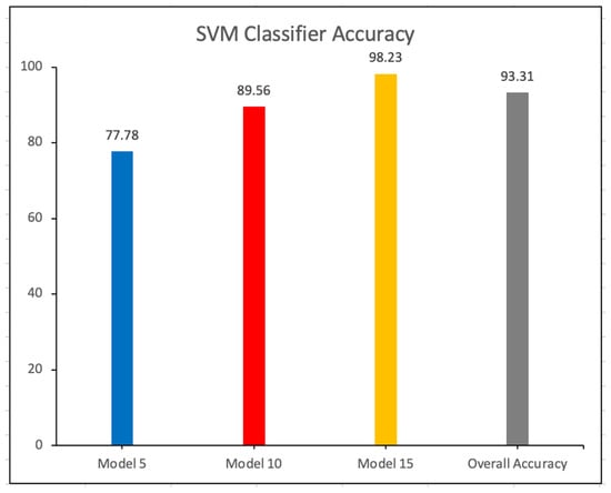 The testing was also implemented with an SVM classifier. Figure 4 shows the accuracy of the SVM classifier in different models. The accuracy of the SVM classifier is 93.31%.