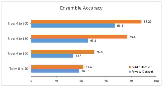 The testing was implemented with an embedded ensemble classifier, but the ensemble classifier had a different procedure. The ensemble classifier uses distinctive trees instead of models. Two further losses were calculated while testing with the embedded ensemble classifier. Figure 5 shows the loss of ensemble training, and Figure 6 shows the accuracy of the ensemble
