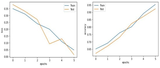 The convolutional neural network (CNN) uses two Conv2D layers followed by two MaxPooling2D layers, two Dense layers, and a Dropout layer. The CNN uses the ReLU activation function for the Conv2D and Dense layers, and the Softmax activation function for the output layer. The first Conv2D layer has 64 filters with a kernel size of (3, 3), which means that the layer will learn 64 different 3 × 3 convolutional filters to extract features from the input images. The second Conv2D layer has 32 filters with the same kernel size, which means it will learn 32 different filters to extract more abstract features from the previous layer’s output. The MaxPooling2D layers reduce the dimensionality of the feature maps produced by the Conv2D layers. The first MaxPooling2D layer has a pool size of (3, 3), which means it will reduce the feature map size by a factor of 3 × 3, and the second MaxPooling2D layer has a pool size of (2, 2), which means it will reduce the feature map size by a factor of 2 × 2 [33]. The two Dense layers consist of 128 and 1 units and are connected to the flattened output of the second MaxPooling2D layer. The first Dense layer uses the ReLU activation function, which introduces non-linearity to the model and helps it to learn more complex representations. The second Dense layer has one unit and uses the Softmax activation function to produce a probability score for each of the two classes. The input images are resized to 224 × 224 with 3 color channels, which is a common image size used in CNNs [34].