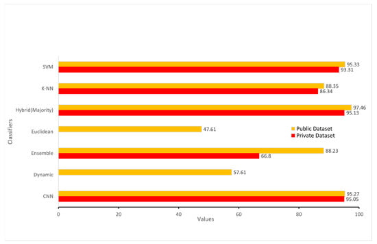 Figure 9 represents the comparison of the public dataset and private dataset. After applying majority voting on hybrid classifiers, the accuracy is increased. We used the MV algorithm in our model to ensure that the proposed embedded system has high performance. We needed an odd number of classifiers to use the MV algorithm.