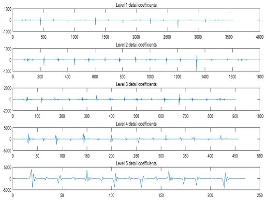 The number of decomposition layers can not be determined by SNR, and the actual de-noising effect should be observed. On the one hand, the filtered noise is required to be clean, and on the other hand, the denoising effect should avoid the signal being over-filtered. Through comparison, it is found that, as shown in Figure 8, Figure 9 and Figure 10, when the decomposition level is 5, the curve with decomposition level of 5 not only retains the overall trend information of the original signal, but also has a good approximation for local detail information, so the denoising quality is good. Therefore, we choose the five levels. The detail coefficients and approximate coefficients under different decomposition layers are obtained, as shown in Figure 11 and Figure 12.