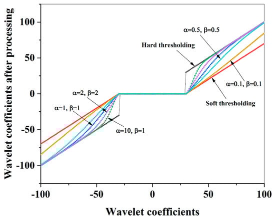 When , ,the improved threshold function is a soft function; when or , the improved threshold function is a hard function. Therefore, the improved threshold function has good continuity at the threshold point. According to the parameters and , it can adapt to different signals.