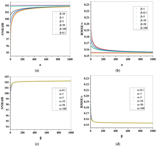 SNR and RMSE curves under different parameter values (a) SNR values under different ; (b) RMSE values under different ; (c) SNR values under different ; (d) RMSE values under different .