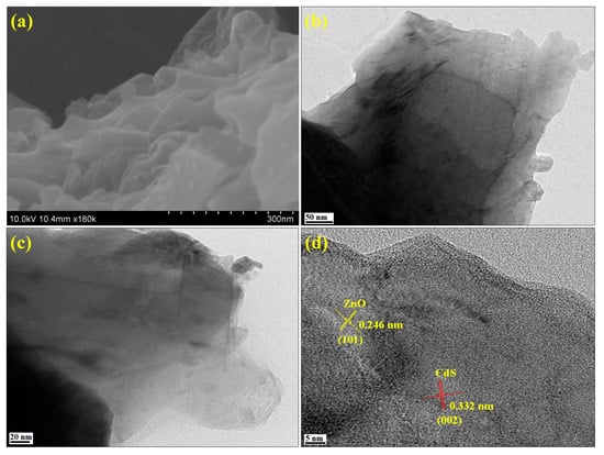 The morphology of the as-synthesized nanostructures was examined using SEM and TEM techniques. SEM micrographs of the Co-doped ZnO/CdS heterostructures exhibited sheet-like structure, as shown in Figure 2a. A similar morphology was obtained from TEM, as displayed in Figure 2b. For further confirmation, an HR-TEM analysis was performed, and these results are illustrated in Figure 2c. These results confirm the formation of 2D–2D, sheet-like structures for both ZnO and CdS in the ZnO/CdS heterostructure. Darker portions in the HR-TEM image are indicative of the sheets perpendicular to the image (out of the plane), and brighter portions indicate the in-plane imaging. The average inter-planar spacing was calculated in ZnO to be 0.246 nm (Figure 2d). This may be attributed to the (1 0 1_0) plane of wurtzite ZnO. A similar observation was made by He et al. []. Hence, (1 0 1_0) side facets along with (0 0 0 1) top facets were confirmed to be the basic building blocks of the ZnO nanosheets. Additionally, the inter-planar distance in CdS was measured to be 0.332 nm, which matches that of the (2 0 0) plane of hexagonal CdS.