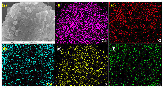 Elemental mapping of Co-doped ZnO/CdS nanosheets. (a) Mapping region, (b) Zn, (c) O, (d) Cd, (e) S, and (f) Co.