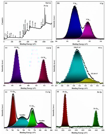 XPS spectra of Co-doped ZnO/CdS nanosheets. (a) Survey, (b) S 2p, (c) Cd 3d, (d) O 1s, (e) Co 2p, and (f) Zn 2p.