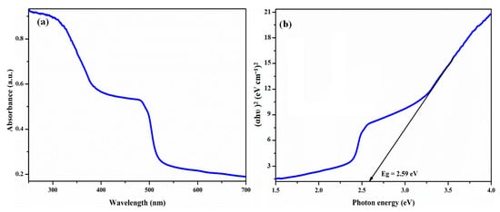 To explore the absorption characteristics of the Co-doped ZnO/CdS nanosheets, the DRS analysis was performed as displayed in Figure 5. From Figure 5a, it can be clearly observed that the absorption edge was strongly shifted towards the higher wavelengths when compared with the bulk ZnO and undoped ZnO/CdS nanostructures []. The significant redshift in the absorption edge indicates the successful growth of the ZnO/CdS heterostructure. Further, the incorporation of the Co ions significantly altered the absorption characteristics by forming intermediate energy levels, extending the absorption capacity to the visible region. The energy bandgap of the as-prepared nanosheets was calculated using Tauc method, as shown in Figure 5b. The bandgap energy value was found to be 2.59 eV, which is greatly reduced when compared to that of the pristine ZnO and pure ZnO/CdS [].