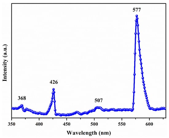 In order to understand the photoemissions related to various defects created in tje Co-doped ZnO/CdS nanosheets, PL measurements were carried out and are depicted in Figure 6. The PL spectrum consists of four peaks located at 368, 426, 507, and 577 nm. The diminished peak positioned at 369 nm is ascribed to the NBE emission, which ascends from the recombined electrons and the holes of the conduction and valance bands, respectively. The other three peaks in the visible spectrum correspond to violet-blue (425 nm), blue-green (507 nm), and yellow (576 nm) emissions respectively. The emission band at 425 nm is associated with the zinc vacancies (VZn) []. The minute serrations in the region of 500–520 nm demonstrates the defects corresponding to cadmium and sulphur []. A sharp yellow emission peak observed at 576 nm is attributed to the 4A2g(F) → 4T1g(F) electric dipole transition of Co2+ ions [].