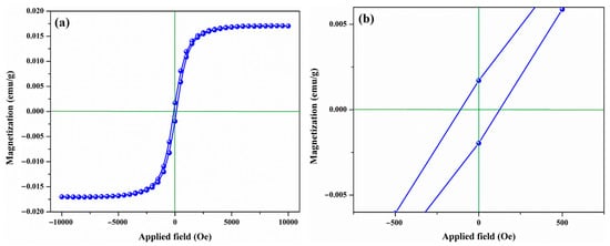 Figure 7 shows the distinct hysteresis loops observed during the VSM analysis of the Co-doped ZnO/CdS nanosheets. The saturation magnetization (Ms) was recorded as 17.07 × 10−3 emu/g, and the retentivity (Mr) was measured to be 1.834 × 10−3 emu/g. Earlier work by the authors of [] was concerned with studying the ferromagnetic behavior of a pure ZnO-CdS composite wherein the ferromagnetic properties of the nanoscale ZnO were attributed to the electron transfer between the zinc and oxygen vacancies for which the defect energy levels due to Zn vacancies were occupied by the p electrons of oxygen. As is evident from Table 2, the Co-doped ZnO/CdS displayed considerably better values of saturation magnetization and retentivity. The doping of Cobalt might have induced (i) compound formation, (ii) the generation/increase of defects such as VO, Zin, VZn, and Oin, and (iii) the incorporation of Co2+ ions into the host lattice. However, no compound formation was detected in the XRD studies, while some PL peaks were attributed to vacancies. Thus, in the present study, mechanisms (ii) and (iii) were said to contribute towards the improved magnetic behavior. The interaction of the Co2+ ions with the defects resulted in the formation of polarons that are responsible for the improved ferromagnetic behavior in the dilute magnetic semiconductor (DMS) system. According to the bound magnetic polaron (BMP) model, a BMP includes a polaron generated from a defect and some magnetic dopant ions located within its strain field, resulting in a bound state responsible for ferromagnetism [].