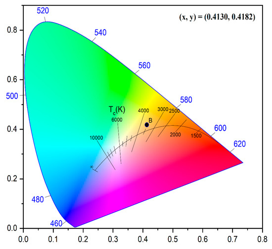 The emission color of the test material plays a vibrant role in optoelectronics and display devices []. Figure 8 displays the CIE 1931 chromaticity diagram of Co-doped ZnO/CdS nanosheets. CIE graphic uses the coordinates (x = 0.4130, y = 0.4182), calculated from PL data, to display the emission color of nanosheets. The yellowish orange emission of the Co-doped ZnO/CdS nanosheets was confirmed by the CIE diagram. Therefore, the Co-doped ZnO/CdS nanosheets may be beneficial for a variety of applications, such as in display devices and optoelectronics. By employing the chromaticity coordinates (x, y), the correlated color temperature (CCT) was computed using the McCamy equation [].