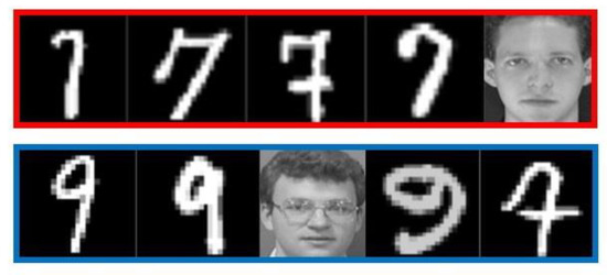 We conduct experiments on the MNIST dataset for k = {2, 4, 6} digits, respectively. For each k, we randomly select 100 images for each digit, down sample each image to 28 × 28 pixels and vectorize it as a vector of length 784. Therefore, the size of Dataset1 is 784 × 100 k, for k = {2, 4, 6}. After that, we randomly replace a fraction p = {1%, 3%, 5%, 10%} of Dataset1 with images from ORL, which were cropped to the same size as digits, i.e., 784-length vectors. Finally, we normalize each column vector to have a unit length. Two clusters in Dataset1 are shown in Figure 2. Dataset1 is denoted as D1 for simplicity, D2~D4 are defined similarly.
