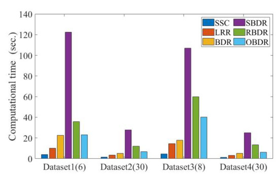 Figure 5 records the computational time of algorithms on Dataset1~Dataset4 with the maximum number of clusters, i.e., Dataset1(6), which denotes Dataset1 with six subjects. It can be seen that SBDR achieves good performance but needs to take a long time to update the subspace structure matrix.