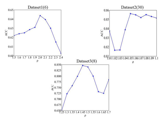 Fixing the number of iterations of Algorithm 1, ρ will directly affect the clustering performance of OBDR. In this section, we search the optimal values of ρ in OBDR on different data sets. We use noise-free data with the maximum number of clusters in Dataset1~Dataset3 as the test sets, such as Dataset1(6). The maximum iteration times of OBDR is set to 500, and the values of λ and γ are set as Table 2. The effect of ρ on OBDR is shown in Figure 6.