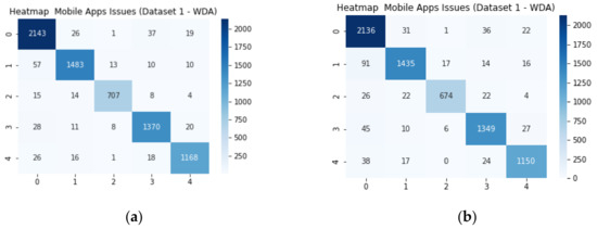 Table 9 demonstrates the optimal hyper-parameters that were used in the experiment to obtain the best model performance. In the ANN experiment, the F1 score reached 80% and 88% using dataset 1 WDA and WODA, respectively, while in dataset 2, the F1 score reached 78% and 89% using WDA and WODA, respectively, in detecting mobile non-functional issues and classifying according to relatives’ class. Figure 6 indicates the model performance according to the F1 score using both datasets. The overfitting problem was raised using datasets 1 and 2, as shown in Figure 10a and Figure 11a; when the data augmentation technique was applied, the overfitting issues were solved, as shown in Figure 10b and Figure 11b.