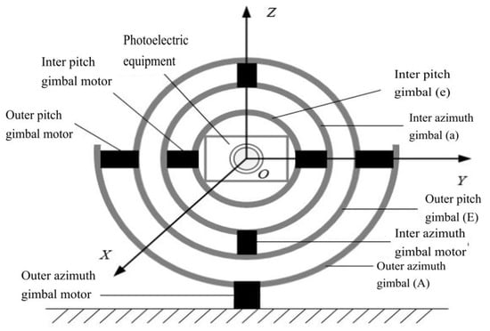 The optoelectronic stabilized platform in this paper adopted a two-axis four-frame structure, as shown in Figure 1. From outside to inside, they were—in order—the outer azimuth gimbal A, the outer pitch gimbal E, the inner azimuth gimbal a and the inner pitch gimbal e. The photoelectric detectors and photoelectric sensors were mounted on the inner frame, and the outer frame was the carrier of the inner frame and follows the inner frame, allowing the inner frame to make small angle movements in the azimuth and pitch axis. The main function of the outer frame of the platform was to carry the inner frame and the photoelectric equipment, and to provide a completely enclosed environment for the inner frame. When the optoelectronic stabilized platform is subjected to huge external disturbances, these disturbances must go through the isolation of the outer frame to transmit to the inner frame, which greatly weakens the disturbances transmitted to the inner frame. The inner frame, as the carrier of the photoelectric equipment, mainly determines the stability accuracy of the optoelectronic stabilized platform.