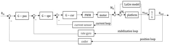 In order to improve the anti-disturbance performance and tracking accuracy of the platform, the platform control system adopted a three closed-loop control scheme consisting of current loop, stabilization loop and position loop. The single-gimbal closed-loop control system is shown in Figure 2. Among them, the current loop was used to reduce the influence of current fluctuation on motor torque output. The stabilization loop was the core of the control system, which was the key to stabilize the visual axis of the platform and improve the anti-disturbance performance of the system. The position loop compensated the distance between the controlled target and the visual axis by taking the miss distance as the control quantity, realizing accurate tracking.