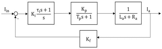 In general, the value of is so small that it can be neglected. In the actual system, the current loop bandwidth is much larger than the speed loop bandwidth, and the back-EMF is a slowly changing disturbance to the current loop, so the effect of the back-EMF can be disregarded when designing the current loop. Figure 3 shows the structure diagram of the current loop; the current controller often uses a PI controller with a transfer function of , where is the gain of the current controller, and is the integration time constant. The transfer function of the PWM is , where is the power amplification coefficient and is the switching period of the PWM square wave. is the current feedback coefficient.