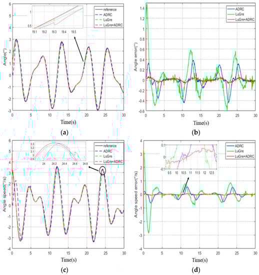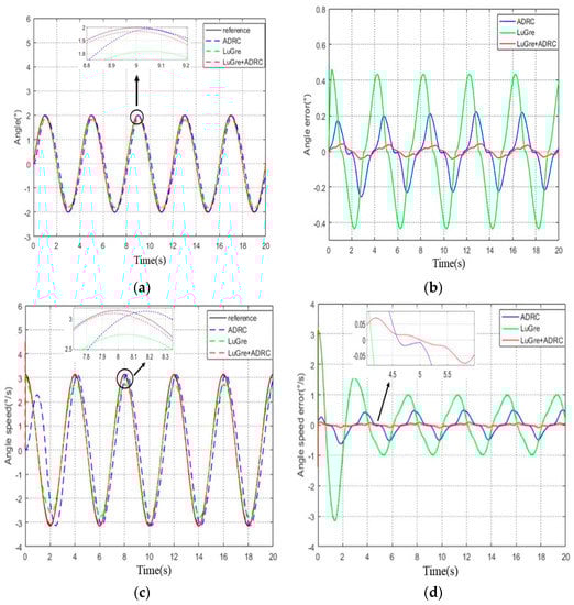 The sinusoidal input signal is the tracking curve of the desired output, and an external disturbance is added to the system. The simulation results of the three control methods are shown in Figure 7, and Table 2 compares the angle tracking error and angle speed error of the three control methods in terms of both maximum (MAX) value and root mean square (RMX). Figure 7a represents the angle tracking curve, and it can be seen from the figure that the ADRC with the LuGre model can track the given input signal better. Figure 7b represents the angle error curve. The maximum value of the angle error of this scheme is about 0.0628° and the root mean square of the error is about 0.0171°. The root mean square of the error is reduced by 62.54% compared with the ADRC and 93.14% compared with LuGre model feedforward compensation; therefore, the error is significantly reduced.