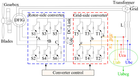 A doubly fed induction generator (DFIG) wind power generation system is shown in Figure 1. It is mainly composed of a converter, control system, generator, blades, and gearbox. The converter converts the alternating current (variable frequency and amplitude) from the generator into constant-frequency alternating current, and it adopts a back-to-back structure. The converter near the grid is called the grid-side converter. It suppresses the current harmonics and stabilizes the DC-link voltage. The converter near the generator is called the rotor-side converter. It tracks the maximum wind energy and improves the system operation efficiency. The grid-side converter and the rotor-side converter have the same structure. The grid-side converter has three bridge arms, and each arm is composed of two insulated gate bipolar transistors (IGBTs). Each IGBT (i.e., Ti) is driven by a gate signal; it is turned off when the signal is 0, and it is turned on when the signal is 1.
