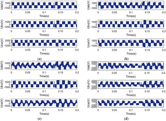 The simulated voltage Uabcg (Uab, Ubc, Uca). (a) Normal state; (b) OC fault occurred in T1; (c) OC fault occurred in T1 and T2; (d) OC fault occurred in T1 and T3.